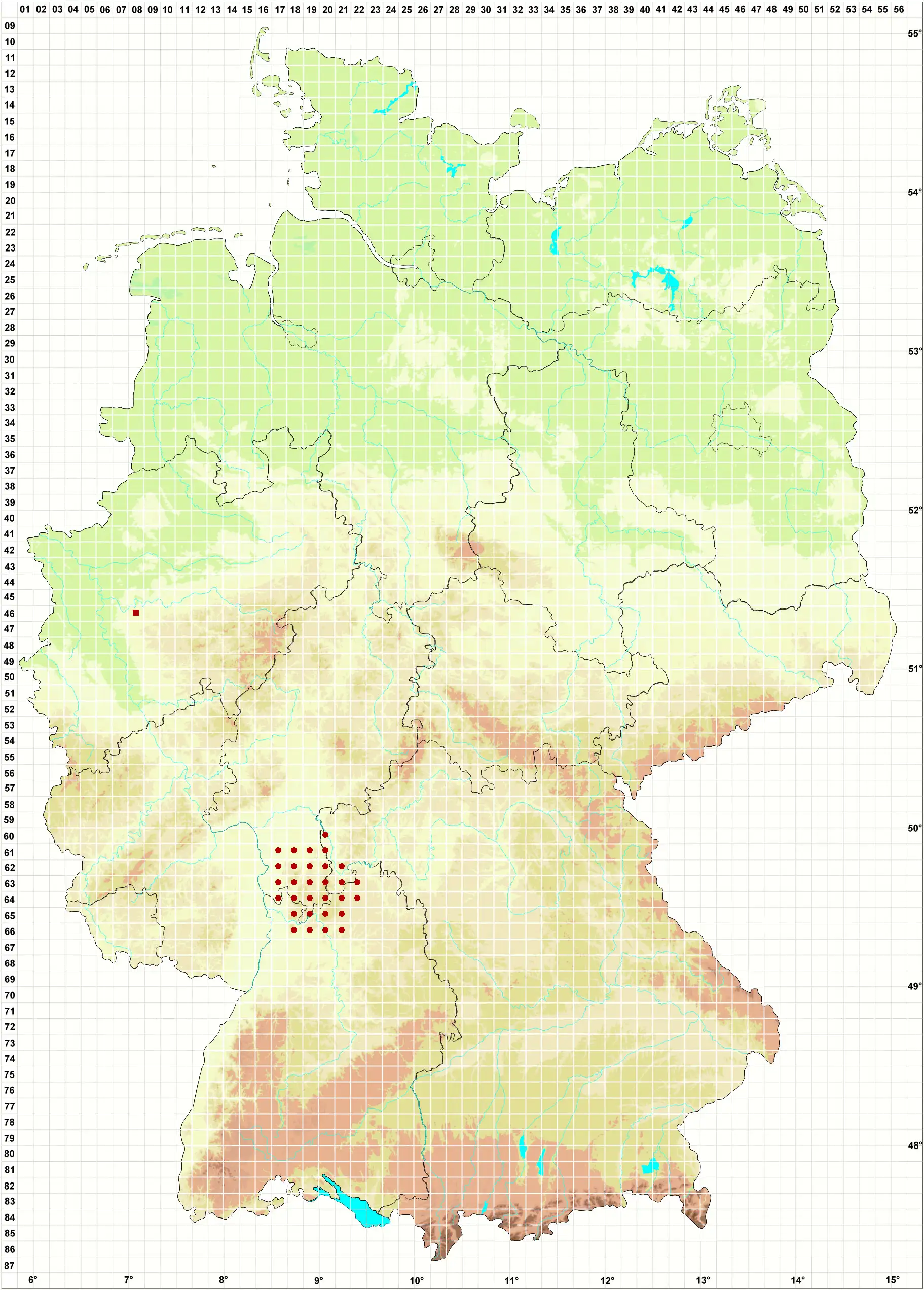 Bitte wechseln Sie zu einem Bundesland, um detailliertere Darstellungen für einzelne Fundstellen einzusehen oder eine genauere Karte zur Weiterverwendung zu beziehen.